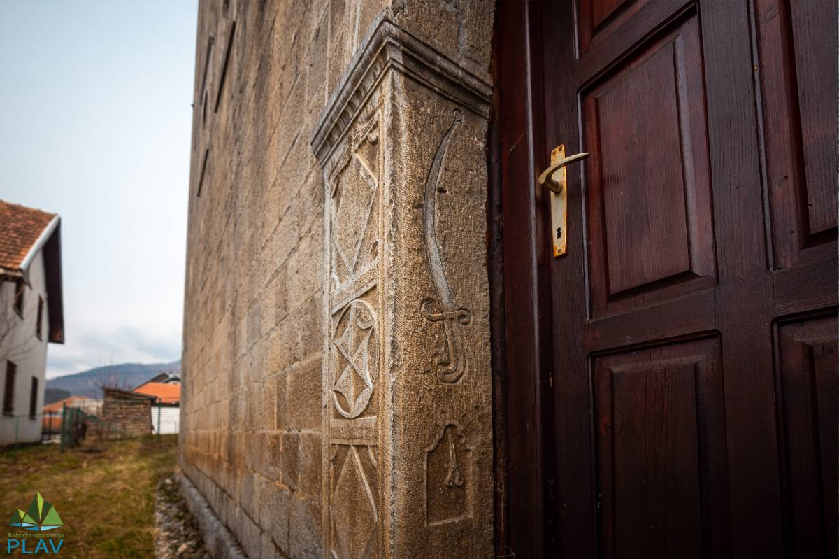 On this tower above the door, divided into two parts by a moon and a star, there is a history of the construction of the building. This history is the longest and most beautiful calligraphically arranged history in Plav. In addition to the history itself, there are also ornaments on the tower. The pillars of the entrance door are specially decorated. There are carved sabers on their inner sides. On the inner part of the right pillar of the entrance door of Šaćir-bey's tower, below the symbol of the saber, there is a symbol of a gun facing the ground. Turning the firearm towards the ground sends the message that the residents of the house are down, they don't want a fight, but they are ready for it. On the inner part of the left pillar of the entrance door on Šaćir-bey's tower, below the saber symbol, there is a scissor symbol. The right pillar represents the host, and the left represents the hostess.
