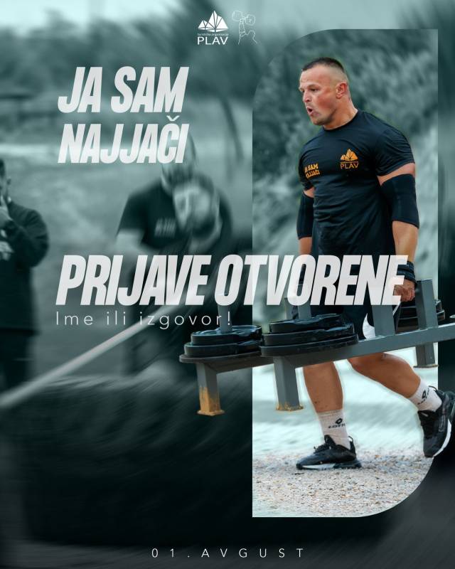 JA SAM NAJJAČI𝐒𝐀Č𝐔𝐕𝐀𝐉 𝐃𝐀𝐓𝐔𝐌Spremite se za test izdržljivosti koji će okupiti najjače ljude u regionu!Datum održavanja: 1. avgustVidimo se!
